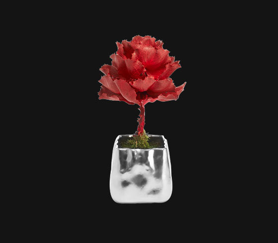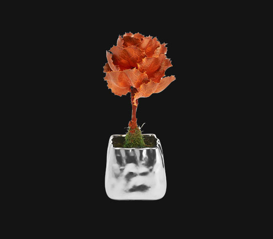 彩色的叶子是女王花的真实叶子,每一片都是做过防腐处理,不会招虫子,花器是陶瓷的,外面喷了金属漆。整件作品看起来色彩斑斓,威武挺拔,别具一格,既时尚又逼真,让人过目难忘。